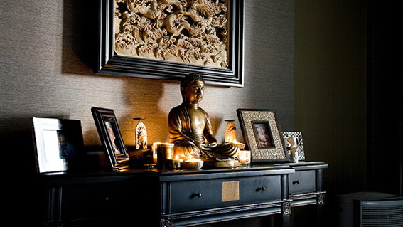 It is not common to find Buddha statues being decorated. In this temple, at the exact position where Buddha sat to meditate, you can find a