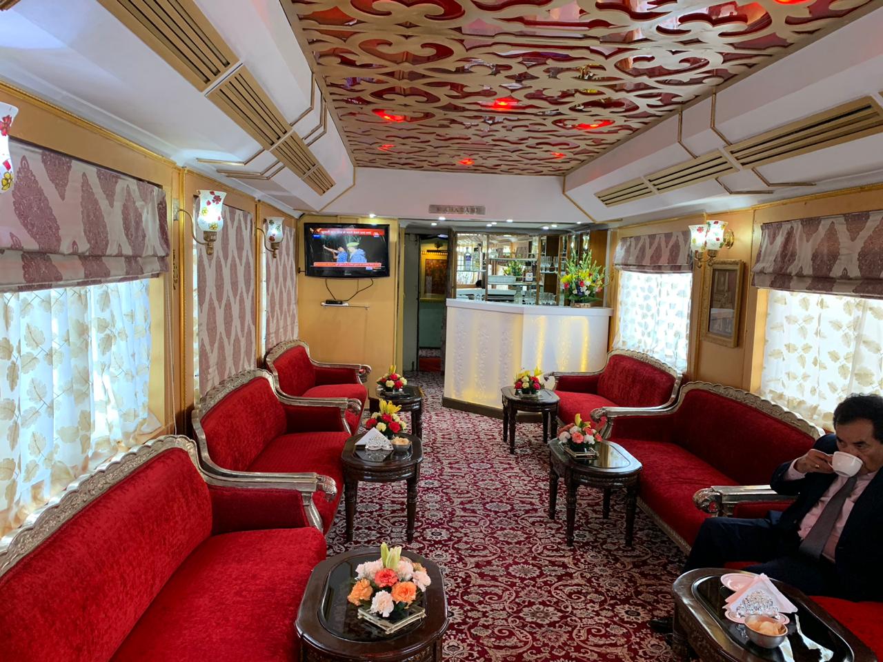 Each guest carriage is done in a luxury comfortable way and ethnic paintings or wall hangings. It is one of the most spacious luxury trains with only 8 guests per carriage. It consists of 2 well appointed Presidential Suites each having a sleeping area, mini bar, writing desk, and 2 private washrooms2. Extravagance in the world class amenities offered on-board