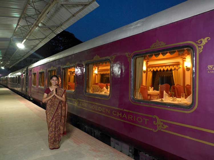 tour a sur de la india. Este tren tiene ambiente lujoso mezclado con elementos culturales. Dos tipos de los tours están disponibles; ambos tours comienzan desde Bangalore. Los coches en este tren tienen muchas instalaciones como alta velocidad a internet, coches comedores, salón, especialmente equipadas Cabañas y otros. Se puede disfrutar servicios reales en este Chariot. TOUR PRIMERO – PRIDE OF THE SOUTH; les llevará Mysore, Belur, Badami, Pattadakal y otros lugares importantes en el camino y viaje termina en Goa. TOUR SEGUNDO - SPLENDOUR OF SOUTH; comienza desde Bangalore y el recorrido estará
