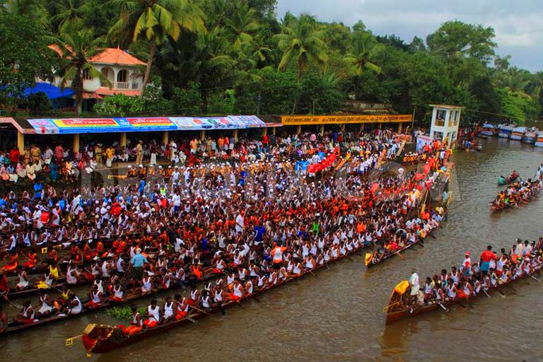 This Kerala Boat Race which is dedicated to Lord Krishna and Arjuna takes place at the time of a special festival of Kerala known as Onam. The boat race is organized in the calendar months of August /September and in the Malayalam calendar month of Chingam. The boats are massive consisting of 100 rowing people and four helmsmen. The specialty of these boat races is that there are 25 singers singing through the race. They sing Vanchipattu songs in the boats decorated with gold lace, a flag, and ornamental umbrellas. In local slang these snake boats are called Palliyodams.